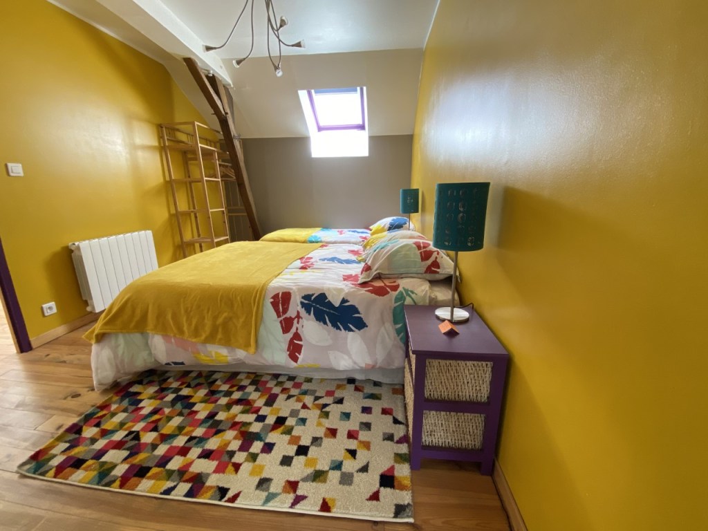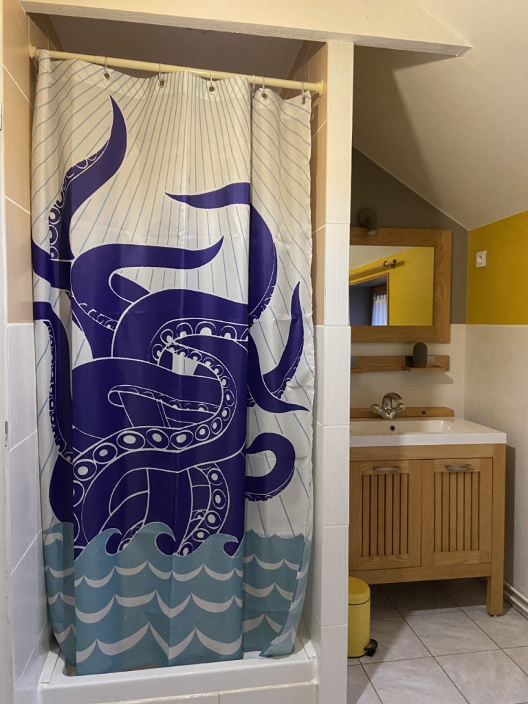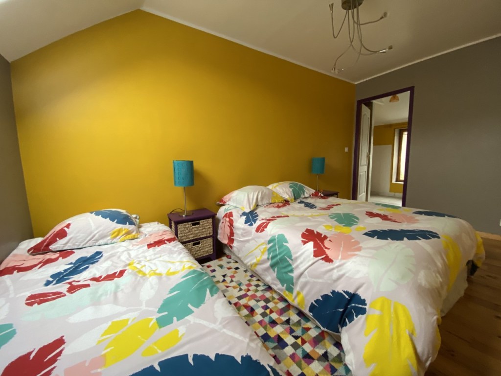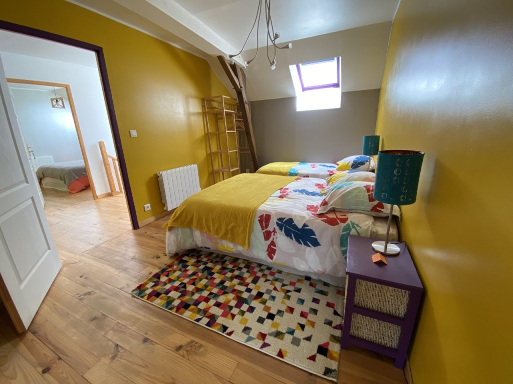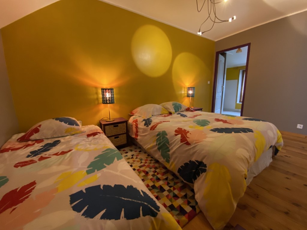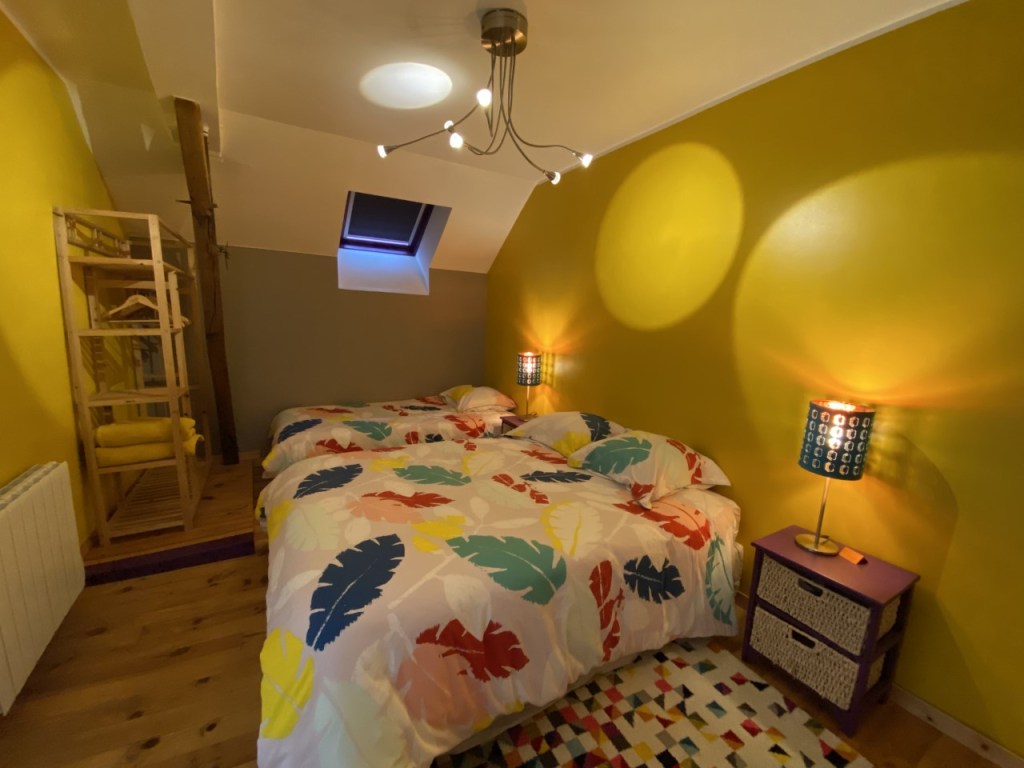 Chambre pour 3 personnes avec un lit double et un lit simple, elle possède sa salle de bain privée avec douche, lavabo et toilette, serviettes et draps fournis.